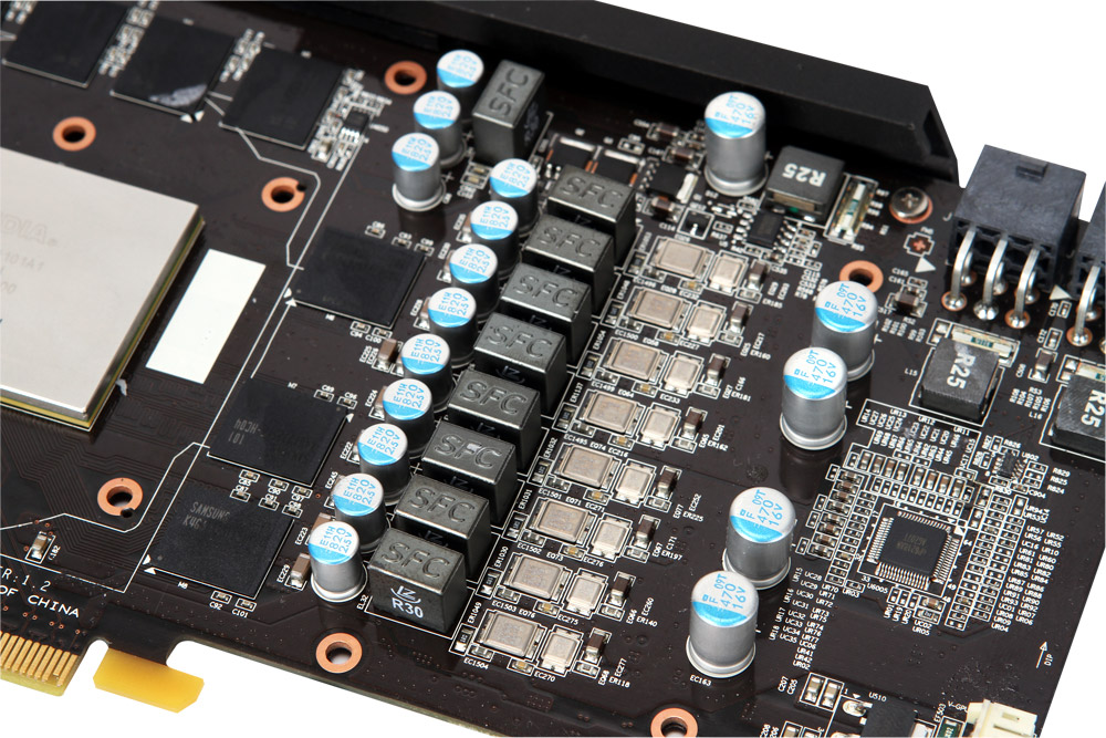 Охлаждение видеоадаптера осуществляется с помощью двухслотового кулера Twin Frozr III, в состав которого входят никелированное медное основание, четыре медные тепловые трубки (из них две 8-мм) и два 80-мм вентилятора с ШИМ-управлением. Производитель утверждает, что данная СО позволяет поддерживать температуру видеокарты на 17°C ниже по сравнению со стандартным кулером, и, кроме того, она еще и тише.
