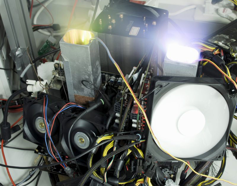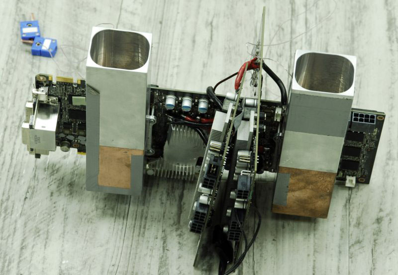 На фото изображен отнюдь не аэроплан, а референсная печатная плата GTX 590 с двумя испарителями и двумя «донорскими» PCB с элементами питания. Мы насчитали девять (!) разъемов PCI-E Power, в том числе два 8-контактных на основной плате. Разумеется, нет никакой необходимости задействовать все разъемы одновременно...