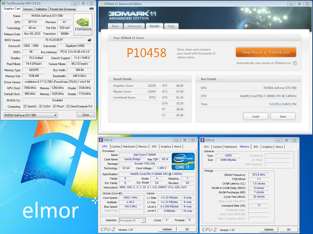 Охлаждение Sandy Bridge жидким азотом, как известно, не дает желаемого эффекта – прирост по сравнению с воздушными кулерами составляет всего 200-300 МГц. Поэтому не стоит удивляться тому, что elmor ограничился традиционной СО на тепловых трубках. Видеокарте, напротив, пришлось пройти испытание холодом (LN2) и повышенным напряжением.