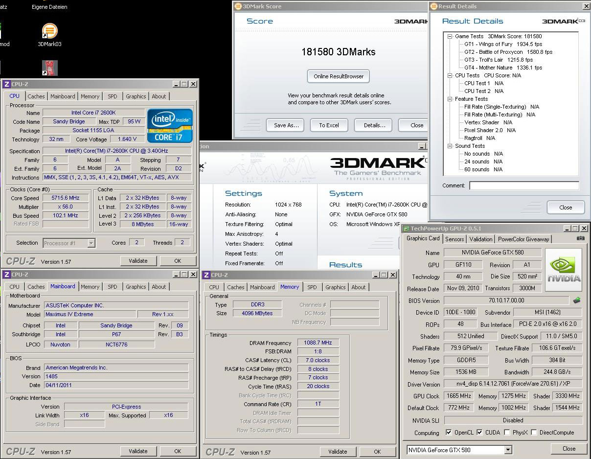 BenchBros собрали экспериментальный стенд из следующих комплектующих: процессор Core i7-2600K (3400 @5715 МГц), материнская плата Asus Maximus IV Extreme, двухканальный (?) комплект памяти Corsair Dominator GTX2 DDR3@2177 и вышеупомянутый видеоадаптер MSI N580GTX Lightning.