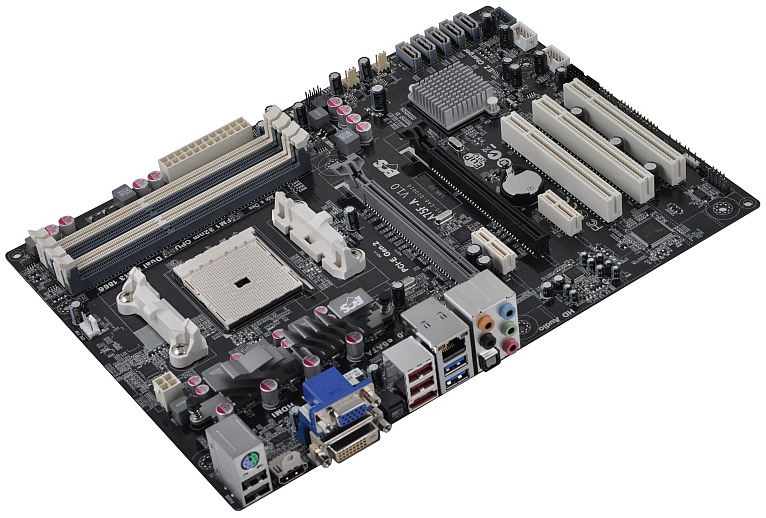 На заднюю панель выведены только два порта USB 3.0 из четырех возможных. Сомнительно смотрится 4-контактный силовой разъем ATX, распаянный вместо 8-контактного EPS12V. Твердотельные конденсаторы задействованы только в подсистеме питания ЦП. Отдельно стоит отметить скромное тепловыделение чипсета A75 (Hudson D3), который ограничивается небольшим игольчатым радиатором.