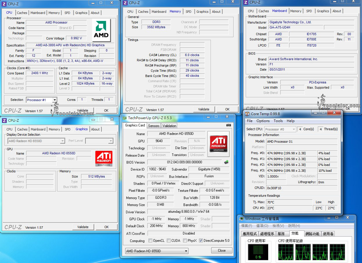 Специалисты Coolaler тестировали Llano на номинальных 2,4 ГГц и в разгоне с повышением напряжения до 1,2 В. Во втором случае частота процессора составляла 5,4-5,5 ГГц (это видно на скриншотах CPU-Z), хотя, судя по итоговым цифрам, в действительности APU работал на ~3,0 ГГц.