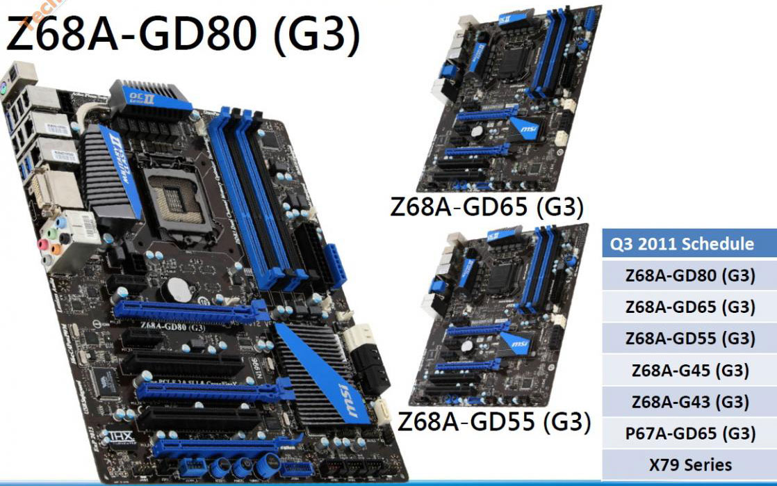 В дополнение к недавним дебютантам MSI Z68A-GD80 (G3) и Z68A-GD65 (G3) тайваньский производитель выпустит в третьем квартале модели Z68A-GD55 (G3), Z68A-G45 (G3), Z68A-G43 (G3) и P67A-GD65 (G3). Они будут использовать переключатель Pericom PI3PCIE, а также поддерживать перспективные 22 нм процессоры Ivy Bridge, наряду с актуальными Core i3/i5/i7-2000. Функциональные возможности новинок, по логике вещей, будут ограничены относительно тандема Z68A-GD80 (G3)/Z68A-GD65 (G3), а цены не превысят отметки 150 евро.