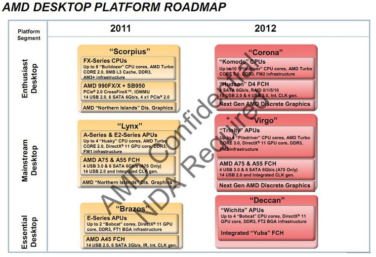 В то время как все находятся в ожидании выхода первых процессоров на архитектуре Bulldozer, компания AMD ведет активную работу над чипами следующего поколения, премьера которых запланирована на следующий год. Так, согласно свежему роадмапу, на смену еще пока не вышедшим FX/Zambezi придут 32-нм чипы под кодовым именем Komodo. О данных решениях было известно еще в прошлом году, однако если ранее указывалось, что они будут насчитывать до 8 вычислительных ядер, то теперь сообщается о 10 ядрах на архитектуре Piledriver. Кроме того, стало известно, что они будут выпускаться под сокет FM2. Процессоры получат поддержку технологии Turbo Core 3.0 и будут иметь в своем составе контроллер памяти DDR3.