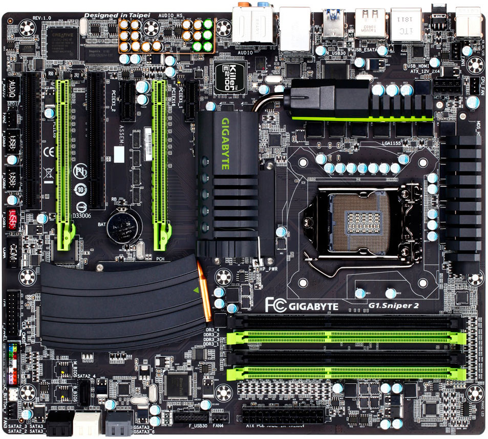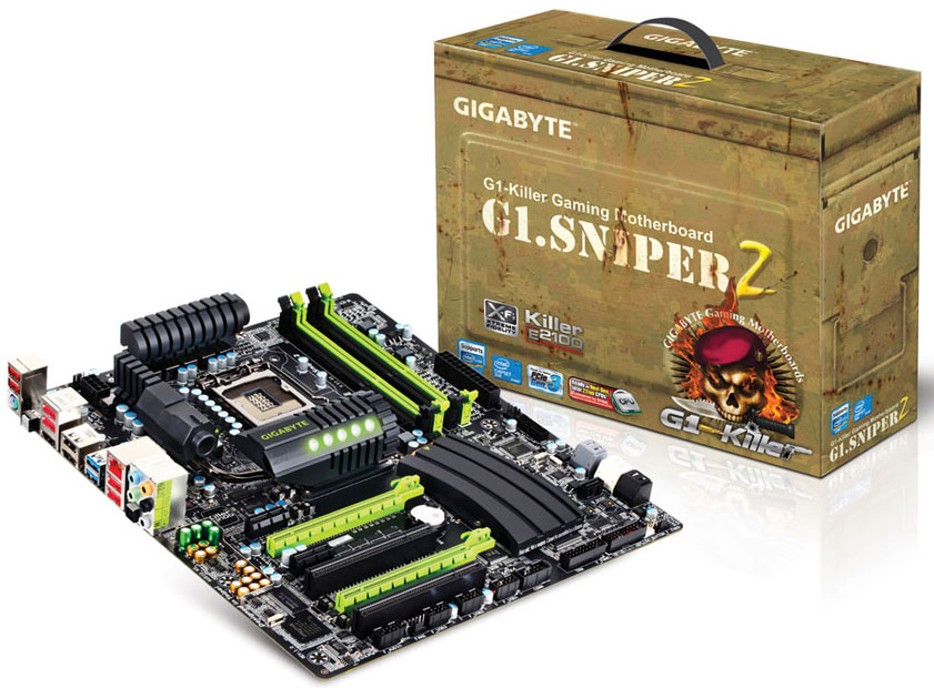 Gigabyte G1.Sniper2 оформлена в милитаристском стиле с использованием черно-салатовой цветовой схемы и чипсетного радиатора в форме «рожка» винтовки M16. На PCB размещены процессорный разъем LGA1155, запитанный от двенадцати фаз, два слота PCI Express x16 (нижний с пропускной способностью x8), по паре PCI и PCIe x1, четыре порта SATA 6 Гбит/с и три SATA 3 Гбит/с. Имеется поддержка графических конфигураций SLI и CrossFire на скорости «x8+x8».