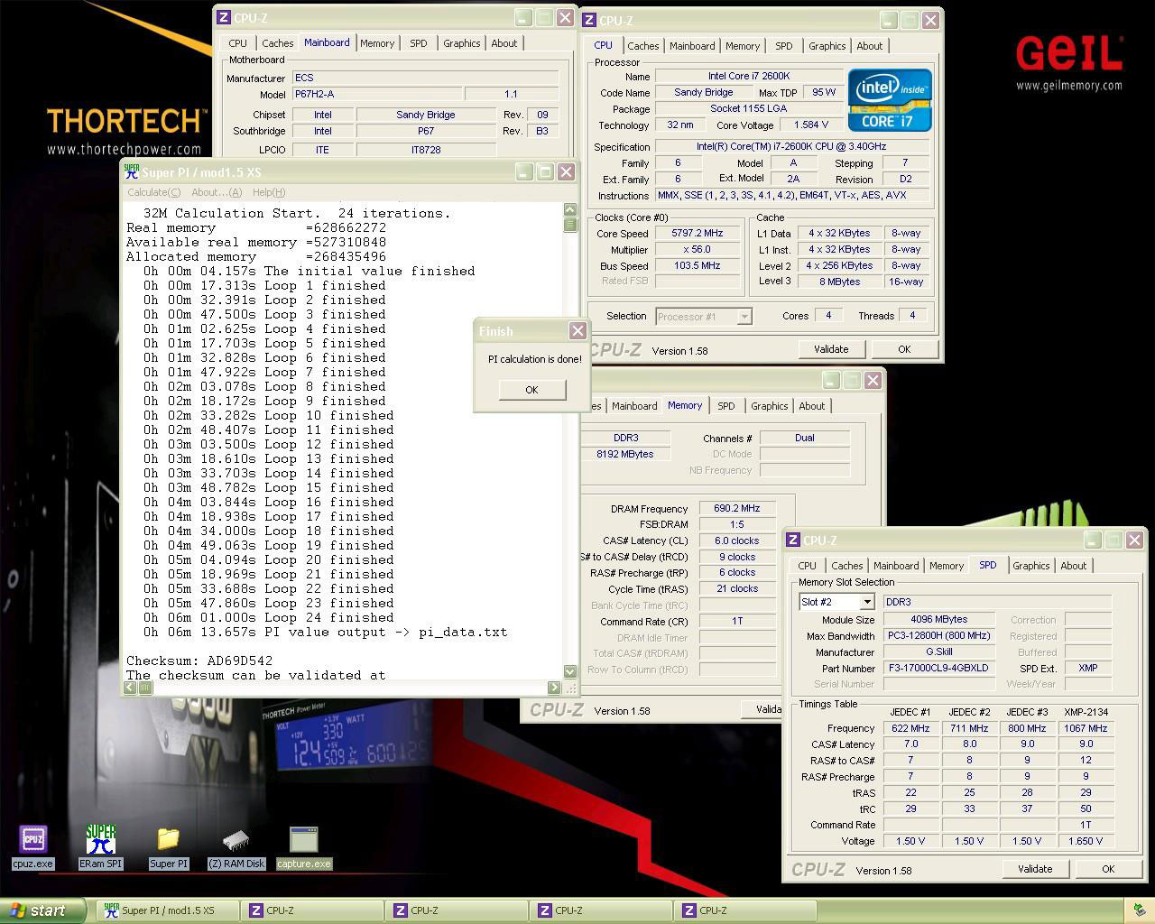 Стенд в составе означенной материнской платы, четырехъядерника Core i7-2600K, 8 ГБ комплекта оперативной памяти G.Skill RipjawsX, 1200-ваттного блока питания и одноступенчатой системы фазового перехода («фреонки») позволил разогнать центральный процессор с 3,4 до 5,8 ГГц. Напряжение Vcore при этом не превышало 1,6 В, что совсем немного для стресс-тестирования. На частоте ЦП 5797 МГц система произвела обсчет 32 млн. знаков после запятой числа Пи за 06:13.657.