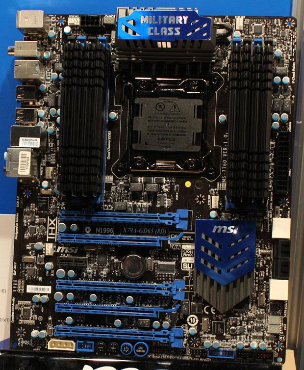 Дуэт MSI X79A-GD65 (8D) и MSI X79A-GD65 оснащен пятью разъемами PCI Express 3.0 x16, подсистемой питания с элементами Military Class III, технологией автоматического разгона OC Genie, звуком THX TruStudio Pro и 8 портами Serial ATA, половина из которых имеют пропускную способность 6 Гбит/с. Приставка «8D» в названии продукта обозначает наличие восьми слотов для оперативной памяти, которая сейчас, надо признать, стоит гроши.