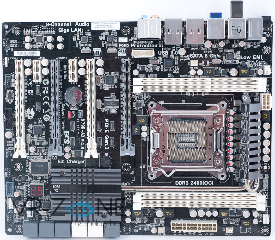 Управляющий чип X79 охлаждается низкопрофильным радиатором, который при помощи тепловой трубки соединен с теплосъемником на VRM. Силовые элементы на тыльной стороне платы обходятся без СО. Сокет LGA2011 изготовлен на мощностях компании-подрядчика Lotes и оборудуется усилительной пластиной (бэкплейтом).