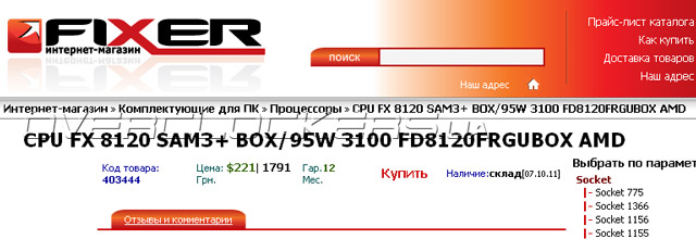К счастью, нам удалось разузнать некоторые подробности о новинке. На склад Fixer она прибыла еще в среду 5 октября. А вот флагмана FX-8150 в продаже пока не ожидается. Из числа характеристик процессора выделим тактовую частоту 3,1 ГГц, 95-ваттный термопакет и совместимость с материнскими платами AM3+.