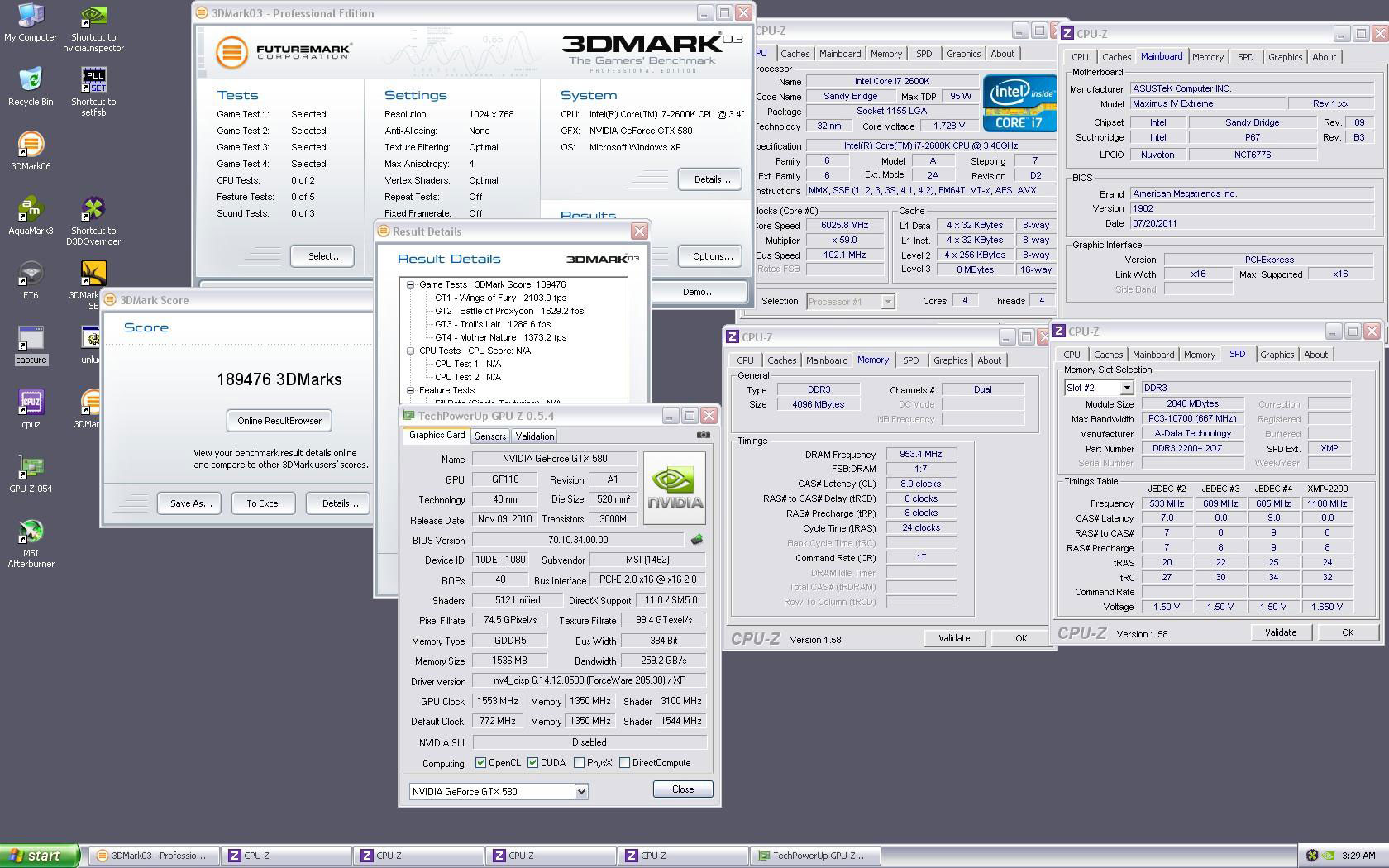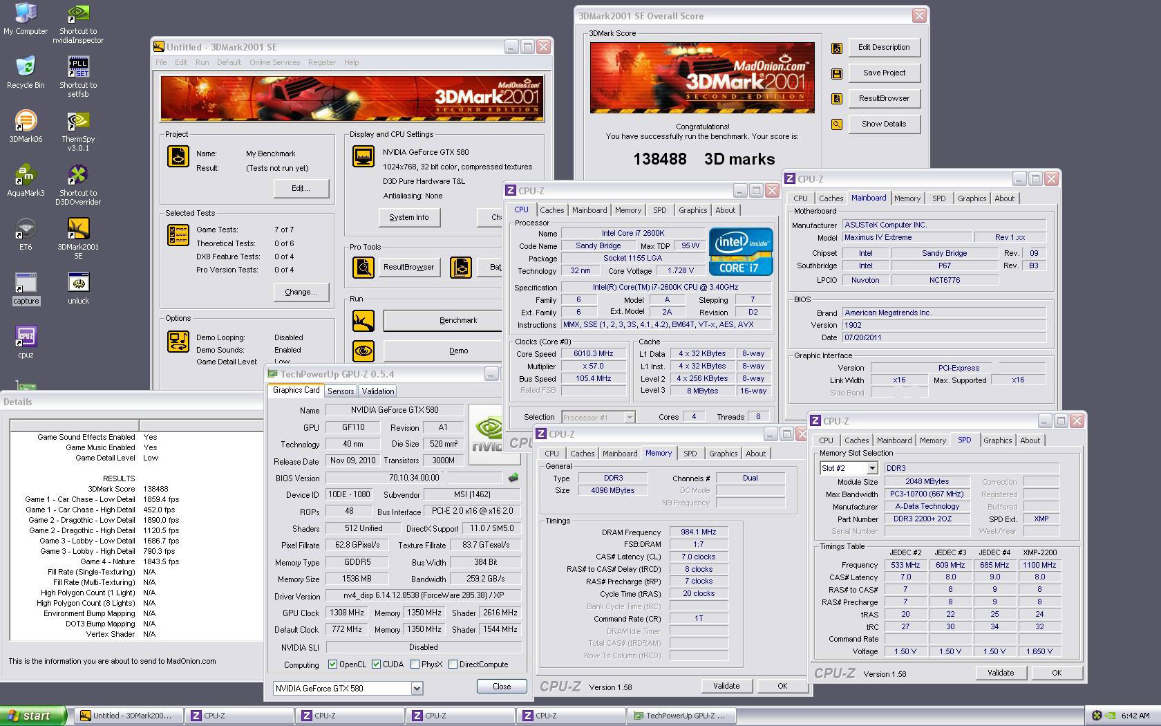 Для этого ему понадобились: отборный процессор линейки Sandy Bridge – Core i7-2600K, функционировавший на частоте более 6 ГГц при напряжении 1,73 В, комплект памяти Adata XPG+ DDR3, который работал на 1968 МГц в первом случае и 1907 МГц во втором, видеокарта MSI N580GTX Lightning, разогнанная до частот 1553/3100/5400 МГц в 3DMark03 и материнская плата Asus Maximus IV Extreme (чипсет Intel P67). Мощность использованного в составе экспериментального стенда блока питания Antec High Current Pro составляла 1200 Вт. Охлаждение ЦП и графического ядра Nvidia GF110 осуществлялось при помощи испарителей с жидким азотом.