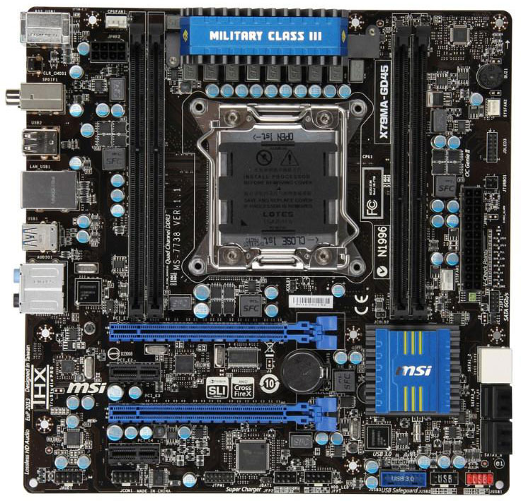 На панели ввода-вывода системной платы MSI X79MA-GD45 находятся разъемы PS/2 (для мыши или клавиатуры), 6 x USB 2.0, кнопка сброса настроек UEFI, оптический и коаксиальный S/PDIF, сетевой разъем RJ-45, пара USB 3.0 и шесть Mini-Jack (аудио).