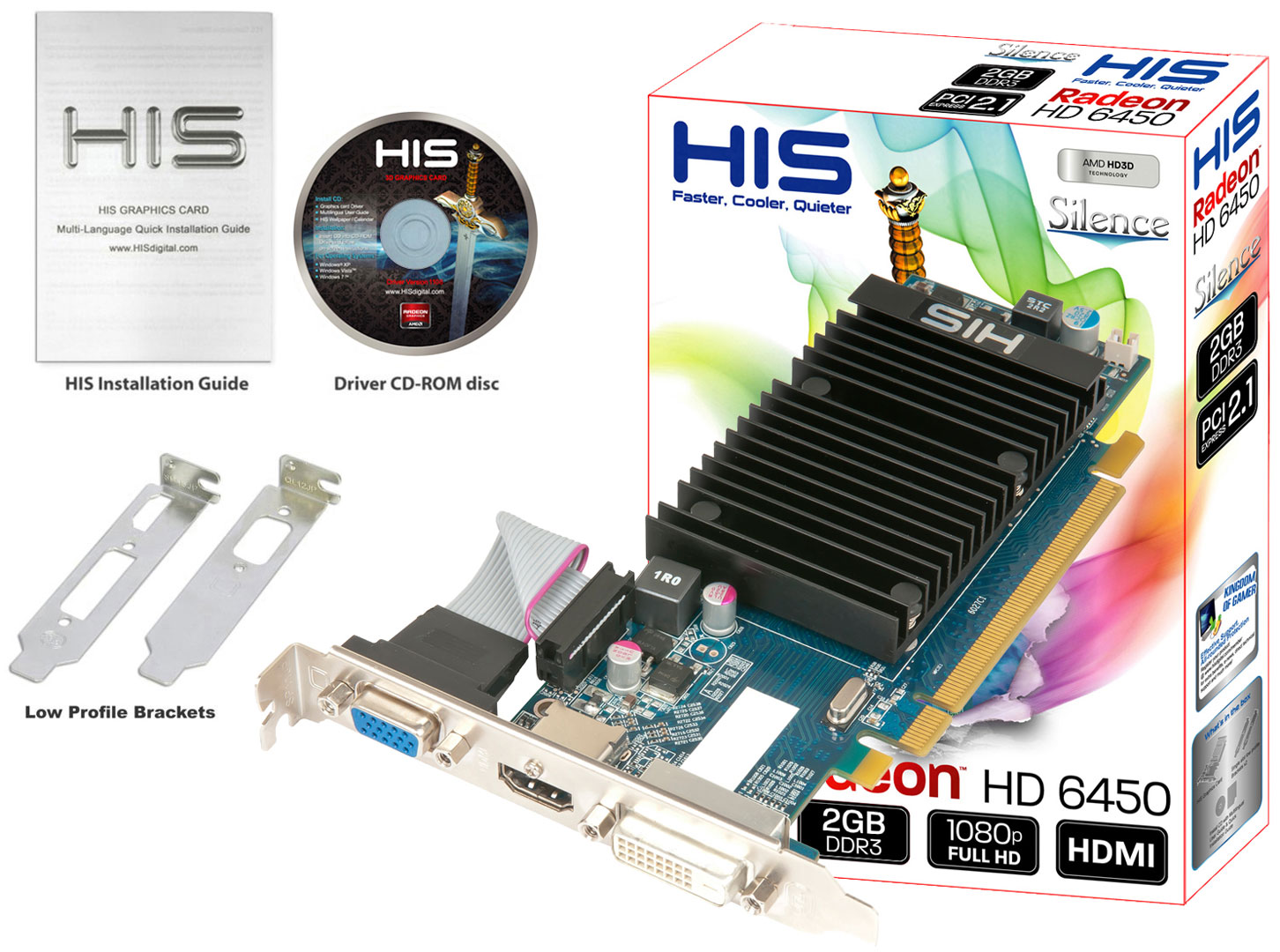 Производитель снабдил данную видеокарту крепежными планками для компактных корпусов и диском с драйверами. Скудный комплект поставки объясняется малым энергопотреблением (около 27 Вт) и отсутствием поддержки технологии AMD CrossFire. Набор видеовыходов достаточно разнообразен как для бюджетного видеоускорителя: Dual-Link DVI-D, HDMI, D-Sub.