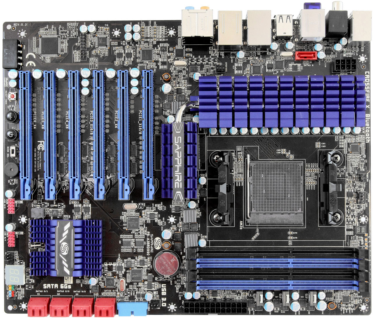Помимо вышеперечисленного, Sapphire Pure Black 990FX располагает четырьмя слотами для оперативной памяти типа DDR3 с двухканальным доступом, кнопками Power, Reset и Clear CMOS прямо на печатной плате, DIP-переключателем между флеш-микросхемами UEFI, четырьмя портами USB 3.0 (2 на задней панели) и 7.1-канальным аудиокодеком Realtek ALC892. Элементы 8-канальной подсистемы питания ЦП накрыты массивным теплосъемником фиолетового цвета. Дополнительное питание подается через разъемы EPS12V 8-pin и Molex 4-pin (внизу печатной платы).