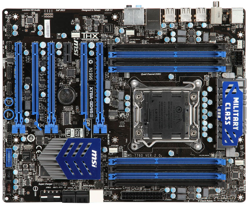 Те наши читатели, кто внимательно следит за новинками от тайваньского вендора, сразу отметили про себя, что данная плата использует чипсет Intel X79 и имеет восемь слотов для оперативной памяти – на это указывает приставка 8D. Помимо этого, решение может похвастать наличием трех слотов PCI Express 3.0 x16 (самый нижний работает на скорости x8) и такого же количества разъемов PCI-E 2.0 x1 (сверху вниз: 2-й, 3-й и 5-й); располагает четырьмя портами SATA 3 Гбит/с, парой SATA 6 Гбит/с, сетевым контроллером Intel 82579, 7.1-канальным аудиоконтроллером Realtek ALC892 и двумя портами USB 3.0 на задней панели.