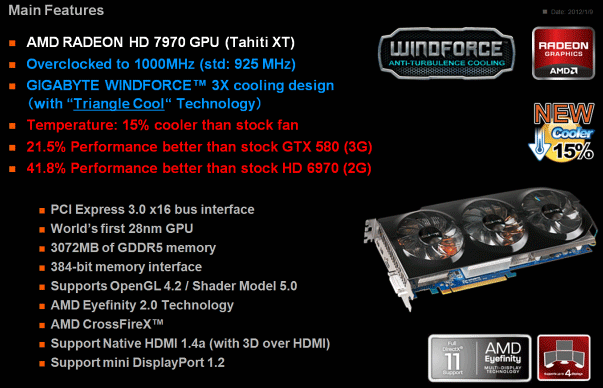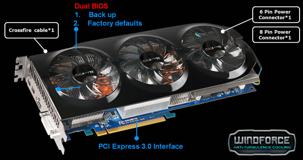 Прирост производительности относительно решений предыдущего поколения Northern Islands и понемногу сдающих позиции Nvidia Fermi 2, очевидно, будет немалым. Плата оборудована 28-нм графическим процессором Tahiti XT с 2048 шейдерными блоками и 384-битной шиной памяти, которая взаимодействует с 3 ГБ видеопамяти типа GDDR5, а также двумя разъемами CrossFire, интерфейсом подключения к материнской плате PCI Express 3.0 x16, четырьмя видеовыходами (DVI, HDMI, 2x Mini DisplayPort) и парой разъемов дополнительного питания PCI-E Power на 6 и 8 контактов. Имеется поддержка API DirectX 11.1 и второго поколения AMD Eyefinity. Двойной VGA-BIOS устранит необходимость перепрошивки микрокода «вслепую» после неудачных экспериментов с разгоном.