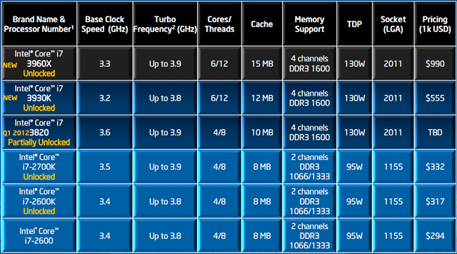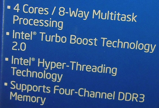 Полные характеристики Core i7-3820 известны еще с прошлого года: это номинальная частота 3,6 ГГц (3,9 ГГц в турборежиме), объем кэш-памяти третьего уровня 10 МБ, встроенный четырехканальный контроллер оперативной памяти DDR3-1600, термопакет 130 Вт и поддержка многопоточной обработки данных (Hyper-Threading). Коробочная версия Core i7-3820 имеет маркировку BX80619I73820, номер S-Spec — SR0LD.