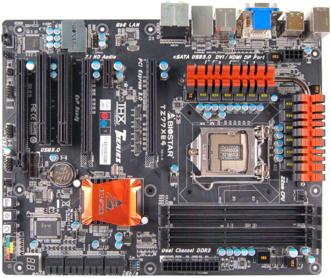 Заметим, что это не первое появление TZ77XE4 в нашей новостной ленте. Предыдущий семпл был выполнен в типичной для Biostar цветастой манере, а вот серийный образец больше напоминает последние изделия Gigabyte — черные разъемы на черной печатной плате. Оранжевые элементы радиаторов, охлаждающих набор системной логики Z77 и транзисторы цепи питания процессора, вызывают приятные ассоциации с Gigabyte GA-X58A-OC.