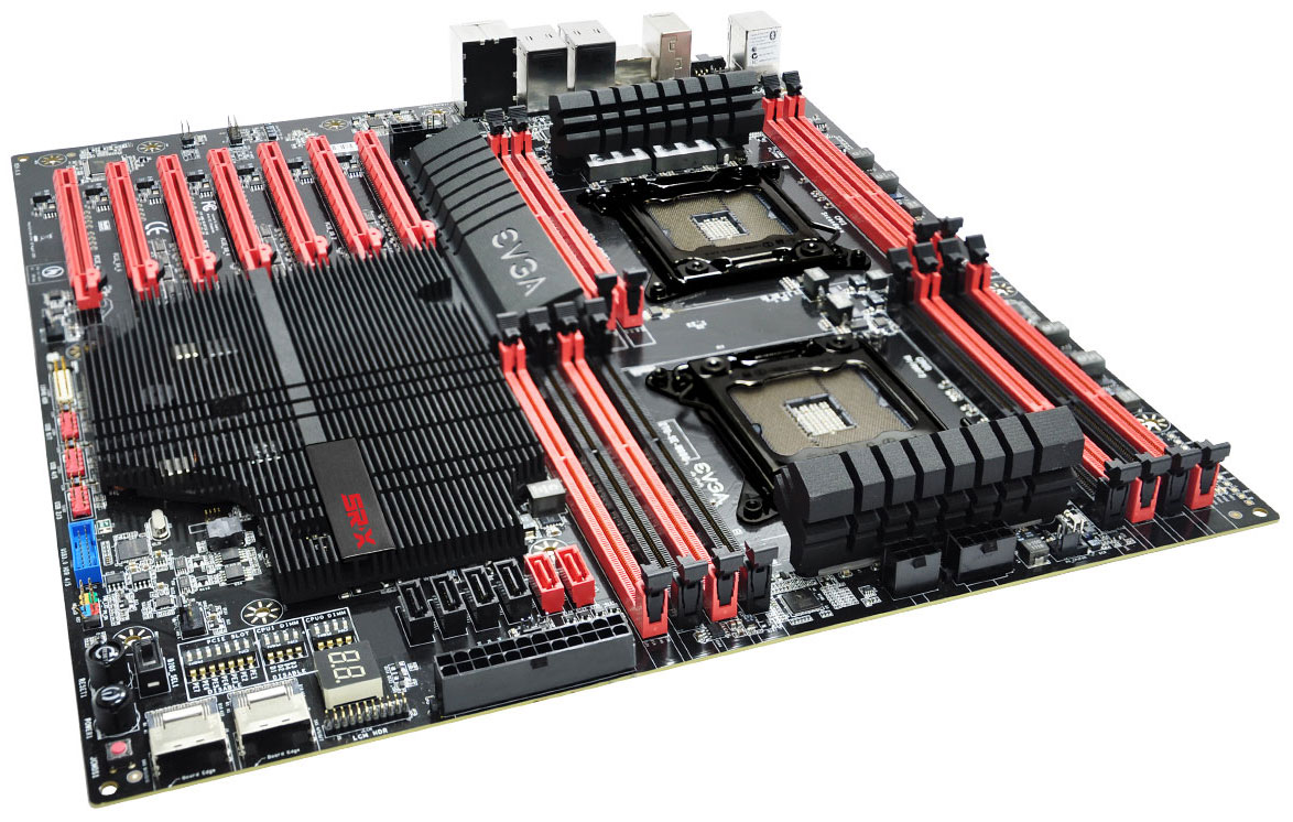 С этого ракурса хорошо видны два мультифазных индуктора в цепи питания одного из процессорных сокетов, что косвенно указывает на использование цифрового преобразователя. Каждое гнездо LGA2011 будет запитано от 6- и 8-контактного силовых разъемов. Накопители по-прежнему предполагается подключать к шести SATA (4x 3 Гбит/с, 2x 6 Гбит/с) и четырем SAS-портам. Двенадцать слотов для оперативной памяти и семь PCI Express 3.0 x16 предоставляют будущему владельцу возможность собрать «домашний суперкомпьютер».