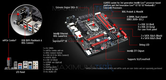 Maximus V Gene поддерживает процессоры Intel Core i3/i5/i7-3000 (Ivy Bridge) и Core i3/i5/i7-2000 (Sandy Bridge), оборудована четырьмя слотами для оперативной памяти DDR3-2600+, двумя PCI Express 3.0 x16 и единичным PCI-E 2.0 x4. Подключить дисковые накопители можно к четырем портам SATA 6 Гбит/с и к двум SATA 3 Гбит/с. Кроме того, Maximus V Gene оснащена шестью USB 3.0 (4 порта на задней панели), видеовыходами HDMI и DisplayPort и комбинированным слотом mini-PCIe/mSATA.