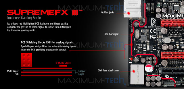 7.1-канальный аудиокодек SupremeFX III имеет комплекс защит от электрических помех.