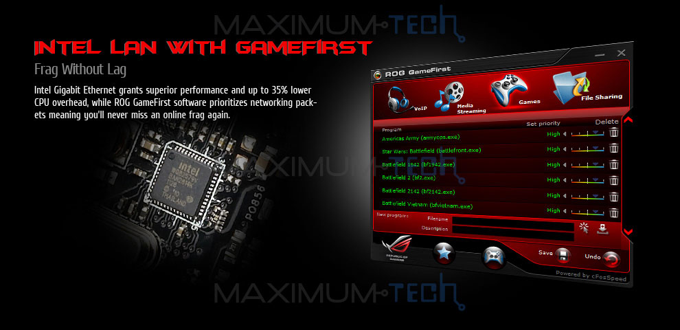 Традиционно для себя Asus снабжает плату целым набором полезных утилит, в их числе — GameFirst для установки приоритетов для приложений, использующих интернет-соединение.