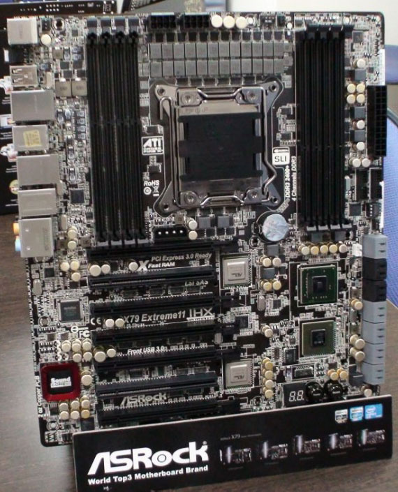 На фото изображена новая модификация ASRock X79 Extreme11 с доработанной подсистемой питания ЦП: вместо 16 силовых фаз теперь применяются 24 фазы (половина транзисторов распаяна на тыльной стороне PCB). Плата поддерживает установку 8 планок оперативной памяти DDR3-2400+, четырех видеокарт Radeon или GeForce (4-Way SLI/CrossFireX на скорости 4x16) и 14 накопителей. Доступны четыре порта SATA 3 Гбит/с, два SATA 6 Гбит/с и восемь SAS 6 Гбит/с под управлением контроллера LSI.
