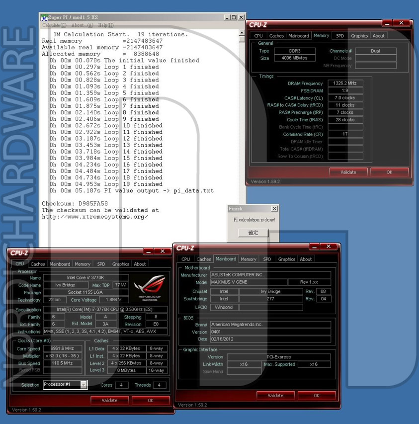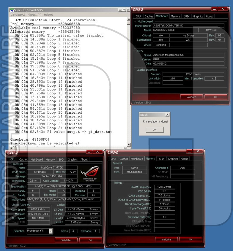 Core i7-3770K. Как и в предыдущих случаях, топовый Ivy Bridge продемонстрировал великолепный разгонный потенциал. В ходе тестирования в бенчмарках SuperPi 1M, SuperPi 32M и PiFast опытный образец Core i7-3770K работал с четырьмя активированными ядрами, но с отключенным Hyper-Threading. Напряжение Vcore повышалось до 1,87—1,91 В.