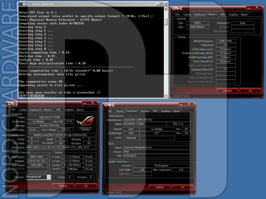 Для тестирования шведы использовали жидкий азот, материнскую плату Asus Maximus V Gene форм-фактора microATX, а также двухканальный комплект памяти DDR3 объемом 2x2 ГБ с эффективной частотой до 2652 МГц в разгоне и таймингами 7-11-7-28-1T.