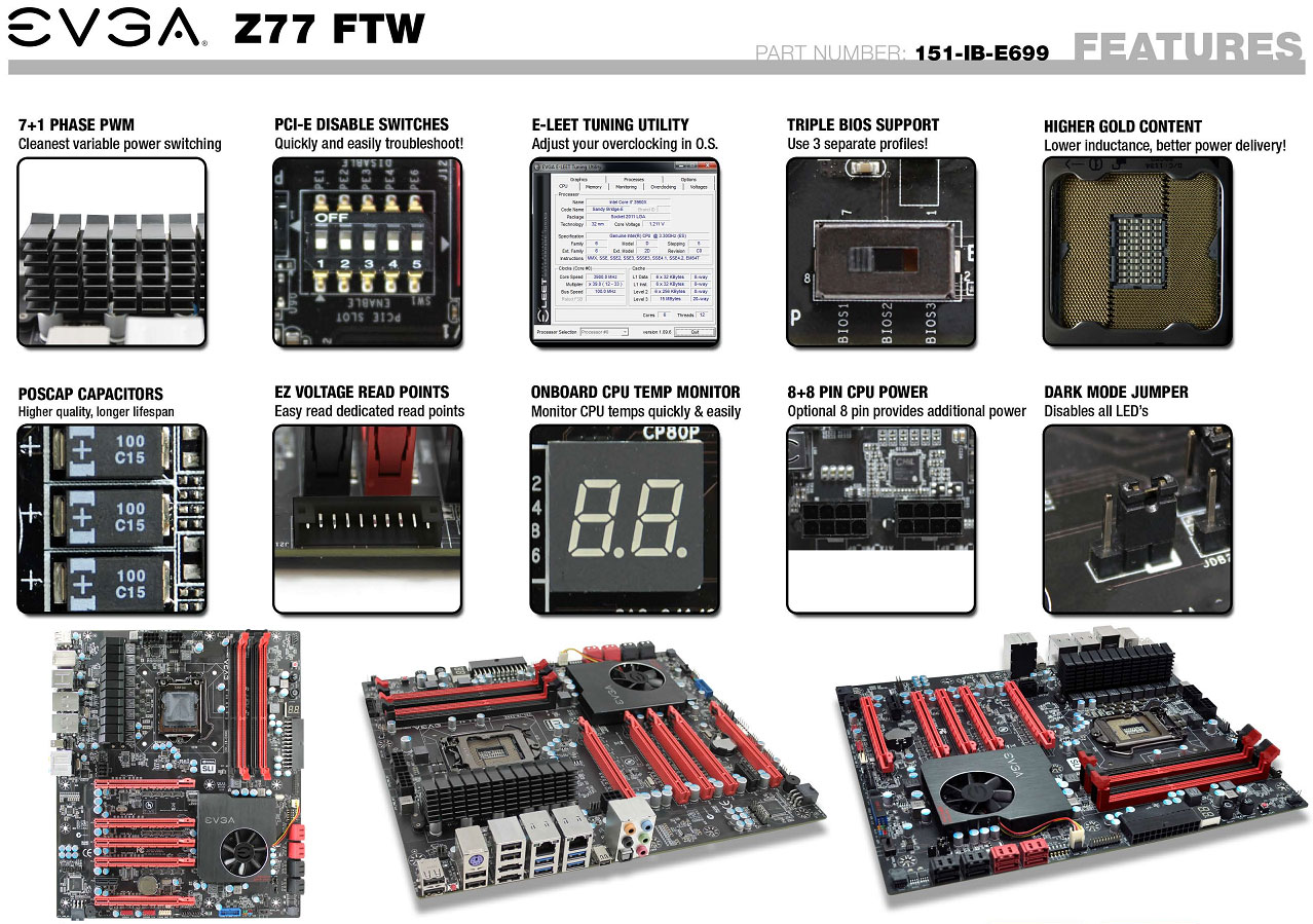 И это не все «фичи» EVGA Z77 FTW. Доступны DIP-переключатели, регулирующие подачу питания к слотам PCI Express 3.0, три микросхемы UEFI, танталовые конденсаторы POSCAP, специальные контакты для замера напряжений и индикатор температуры ЦП.