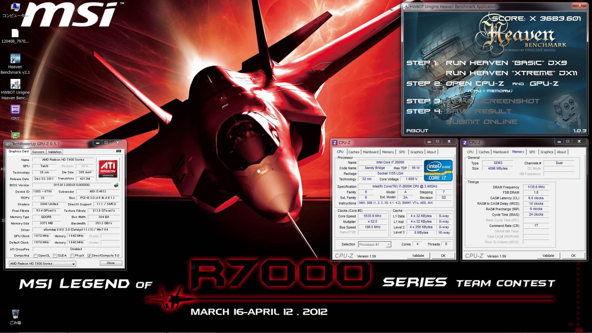 Однако в некоторых бенчмарках потенциал Radeon HD 7970 до сих пор востребован, что накануне подтвердил на практике японский энтузиаст разгона Gyrock. Стенд в составе процессора Core i7-2600K и видеокарты MSI R7970 Lightning в руках японского оверклокера достиг отметки 3683,6 очков в приложении Unigine Heaven (предустановка Xteme DX11).
