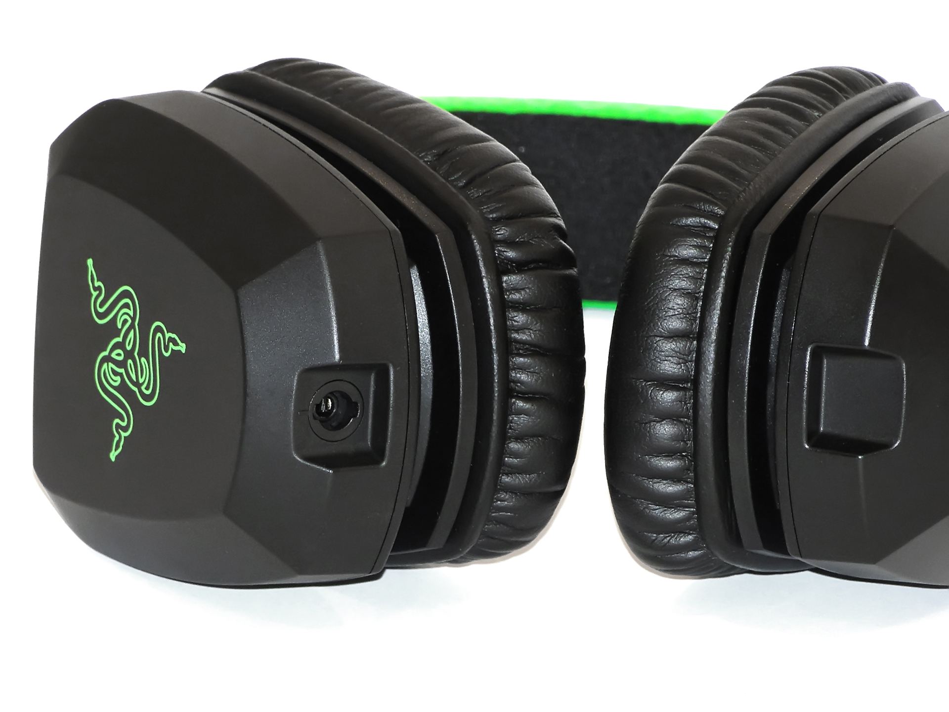 Чаши достаточно широкие выполнены из черного пластика, по бокам красуется лого Razer. Как уже было сказано выше, оба наушника объединены монолитной перегородкой из кожи, имеющей ярко-зеленую окраску с нанесенным именем компании.
