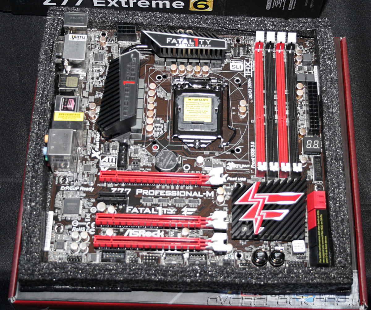 ASRock Fatal1ty Z77 Professional-M — компактная материнская плата, обладающая внушительными, как для своего форм-фактора, возможностями расширения. В актив платы можно занести 11 фаз питания процессора и три слота PCI Express 3.0 x16, функционирующих в режиме х8+х8+х4 при установке трех видеокарт.