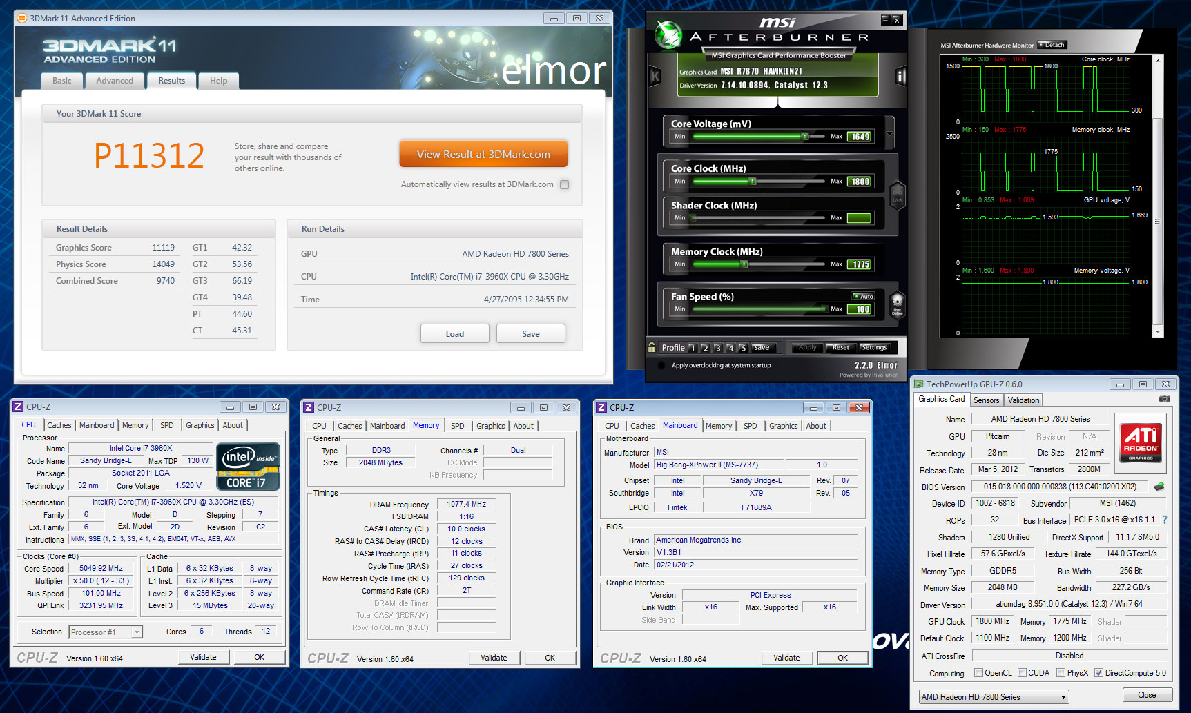 «Замороженный» MSI R7870 Hawk прошел графические тесты на частоте ядра 1,8 ГГц. В частности, на этой отметке был пройден бенчмарк 3DMark 11 в режиме Performance. Разгон памяти составил 7100 МГц (+48% к исходным 4800 МГц). Имея совсем немного времени для тестов, elmor подчеркнул, что видеоадаптер способен на большее — нужно лишь подобрать оптимальные значения напряжений и температур. Так называемый «колдбаг» пришелся на –120 °C.
