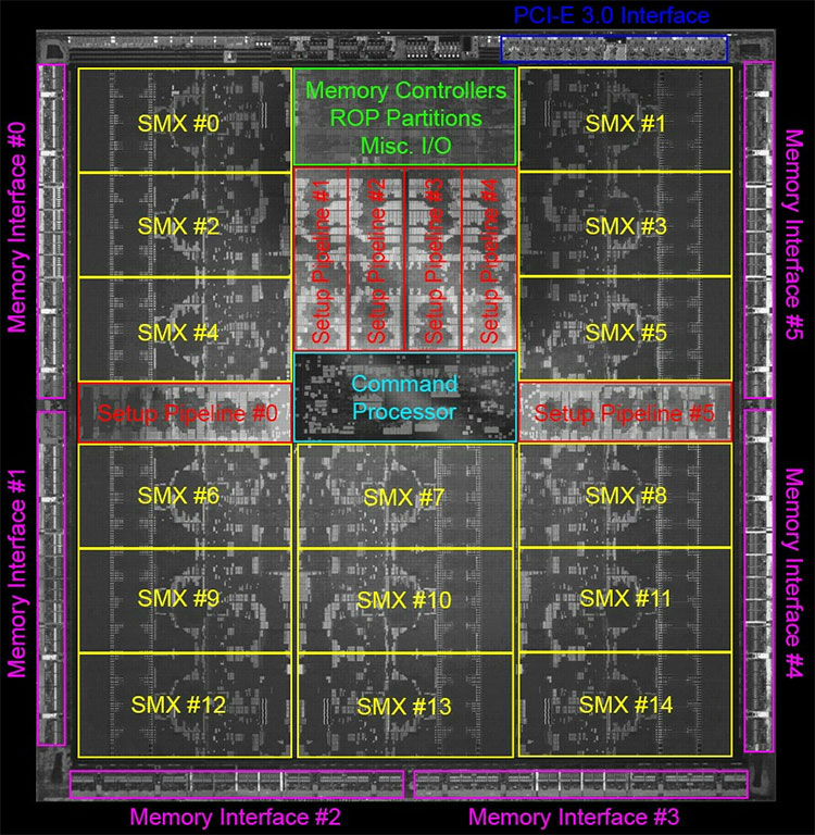 Довольно крупный (до 550 кв. мм) кристалл квадратной формы будет состоять из 7,1 млрд транзисторов. В структуру GK110 включены 15 потоковых мультипроцессоров SMX — по 192 шейдерных блоков в каждом. Для сравнения, у GeForce GTX 680 только восемь SMX. В придачу к 2880 шейдерам карта получит 384-битную шину памяти, а точнее шесть контроллеров GDDR5 по 64 бита. Количество ROP и текстурных блоков не уточняется. Базовым вариантом гипотетической «GeForce GTX 780» станет версия с 3 ГБ видеопамяти, в то время как 6 гигабайт GDDR5 будет доступно в отдельных моделях с внушительным ценником.