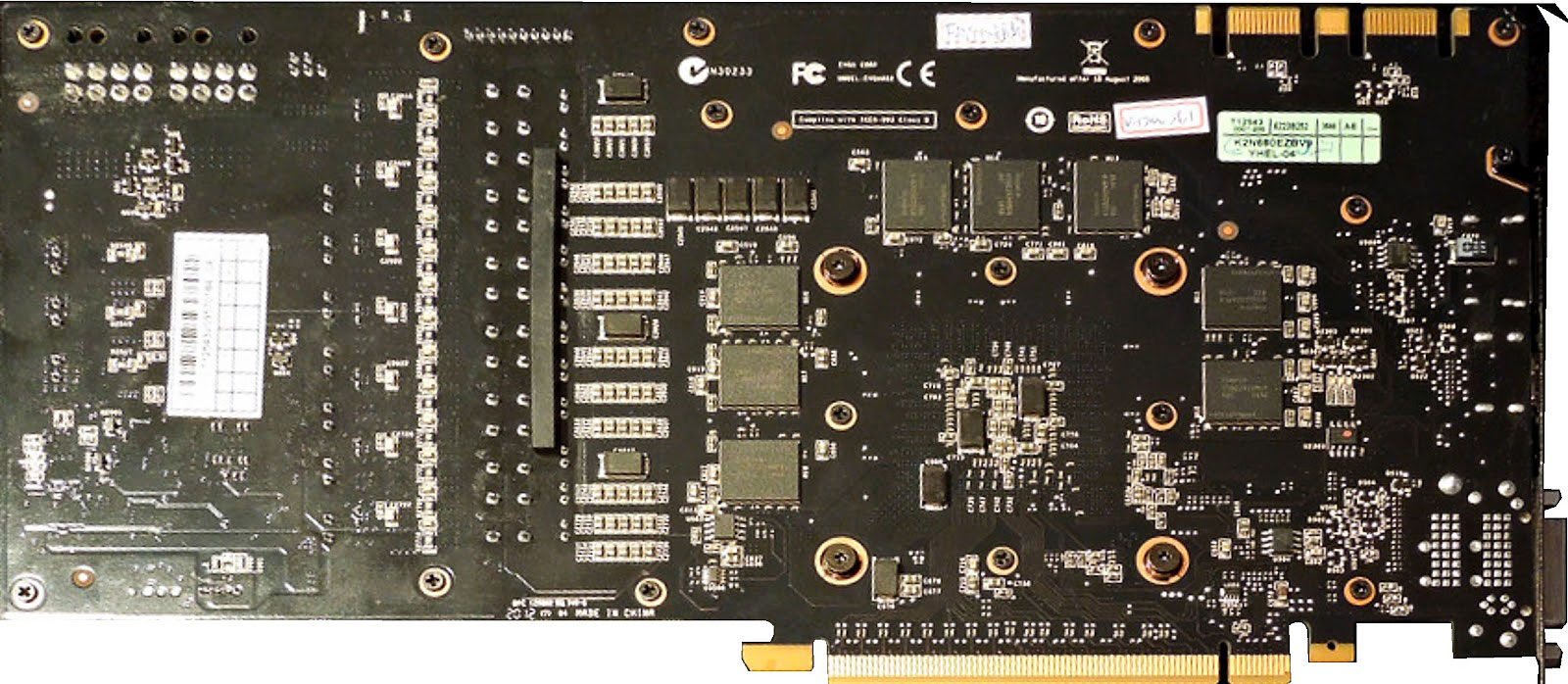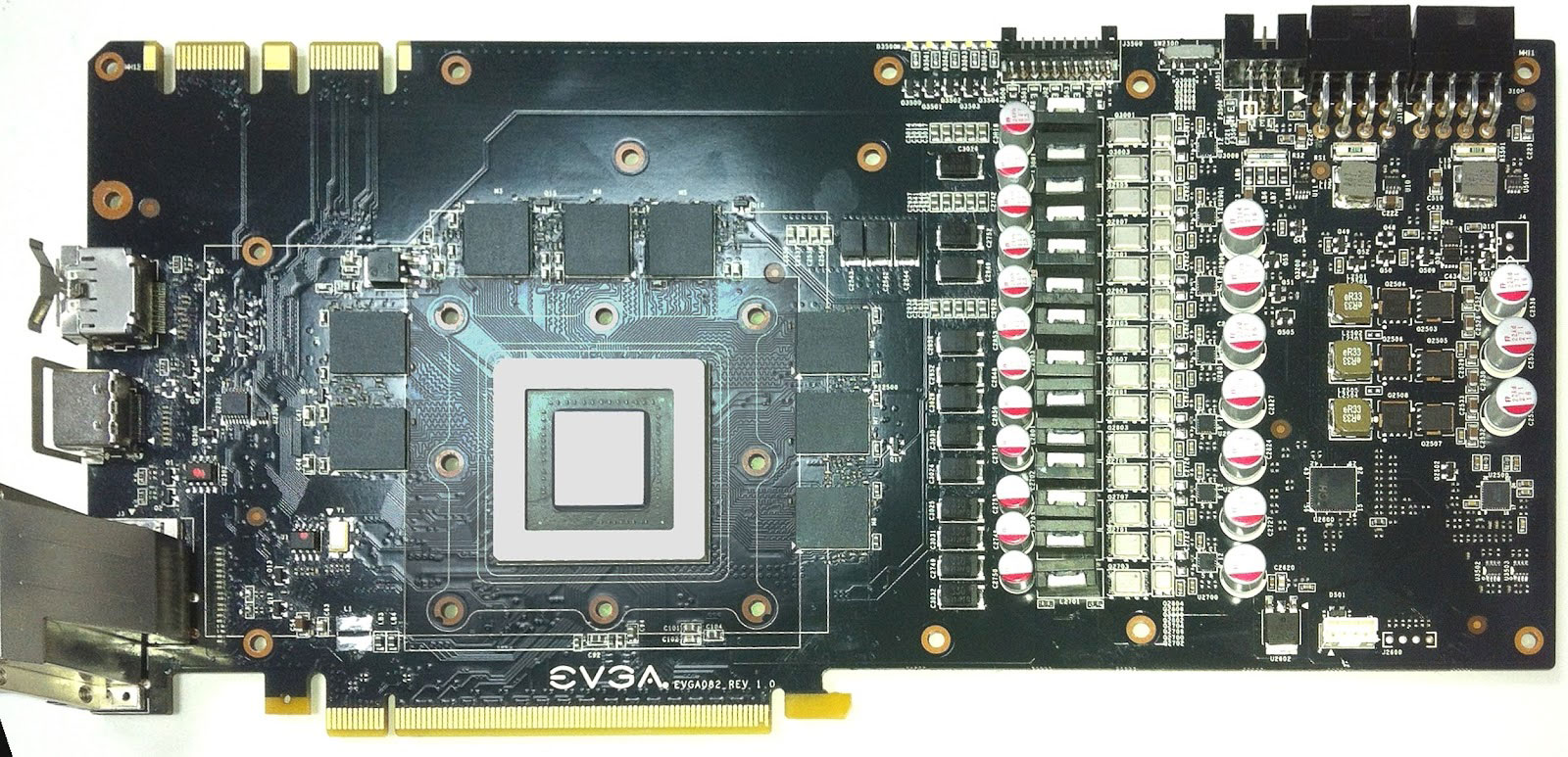 Появились в Сети и снимки PCB. По ним легко определить, что Classified-версия оборудуется двойным объемом набортной памяти (4 ГБ GDDR5), парой силовых разъемов PCI-E Power 8-pin и 14 фазами питания с применением залитых катушек индуктивности, полевых транзисторов в корпусе DirectFET и танталовых конденсаторов.