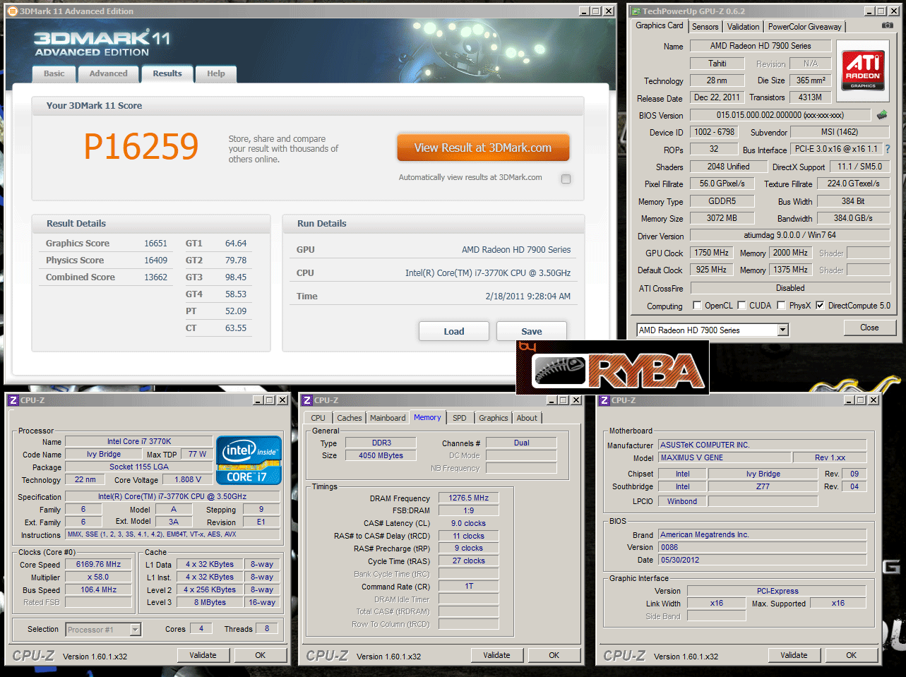 Прибавку в 200 пунктов, по всей видимости, обеспечила материнская плата Asus Maximus V Gene, зарекомендовавшая себя одним из лучших продуктов для экстремального оверклокинга. Видеокарта использовалась та же — версия Lightning адаптера MSI Radeon HD 7970. Она была разогнана при помощи LN2 до частот 1750/8000 МГц для ядра и памяти соответственно. Четырехъядерник Core i7-3770K, охлаждаемый жидким азотом, достиг отметки в 6170 МГц при напряжении 1,81 В. Оперативная память, если не ошибаемся, оборудовалась самодельными радиаторами. Эффективная частота модулей — 2553 МГц при задержках 9-11-9-27. В качестве источника питания был задействован блок серии Enermax Revolution85+.