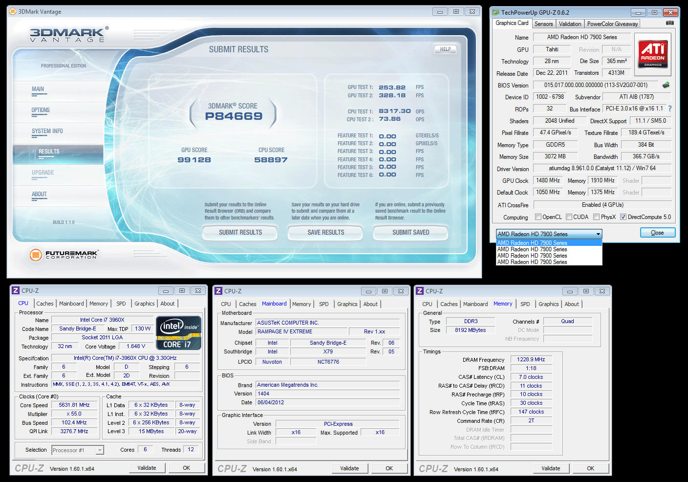 Кроме разогнанных плат HIS 7970 X, в составе стенда были использованы: процессор Core i7-3960X EE @5632 МГц, материнская плата Asus Rampage IV Extreme (X79), оперативная память DDR3 Patriot Viper Xtreme Division 4 на частоте 2458 МГц с таймингами 7-11-10-30-2T, блок питания Antec High Current Pro HCP-1200 и SSD-накопитель Corsair Force Series объемом 120 ГБ. Фотоотчет о рекорде J.Lin и сотоварищи доступен на страничке HKEPC в социальной сети Facebook. Регистрация для просмотра снимков не обязательна.