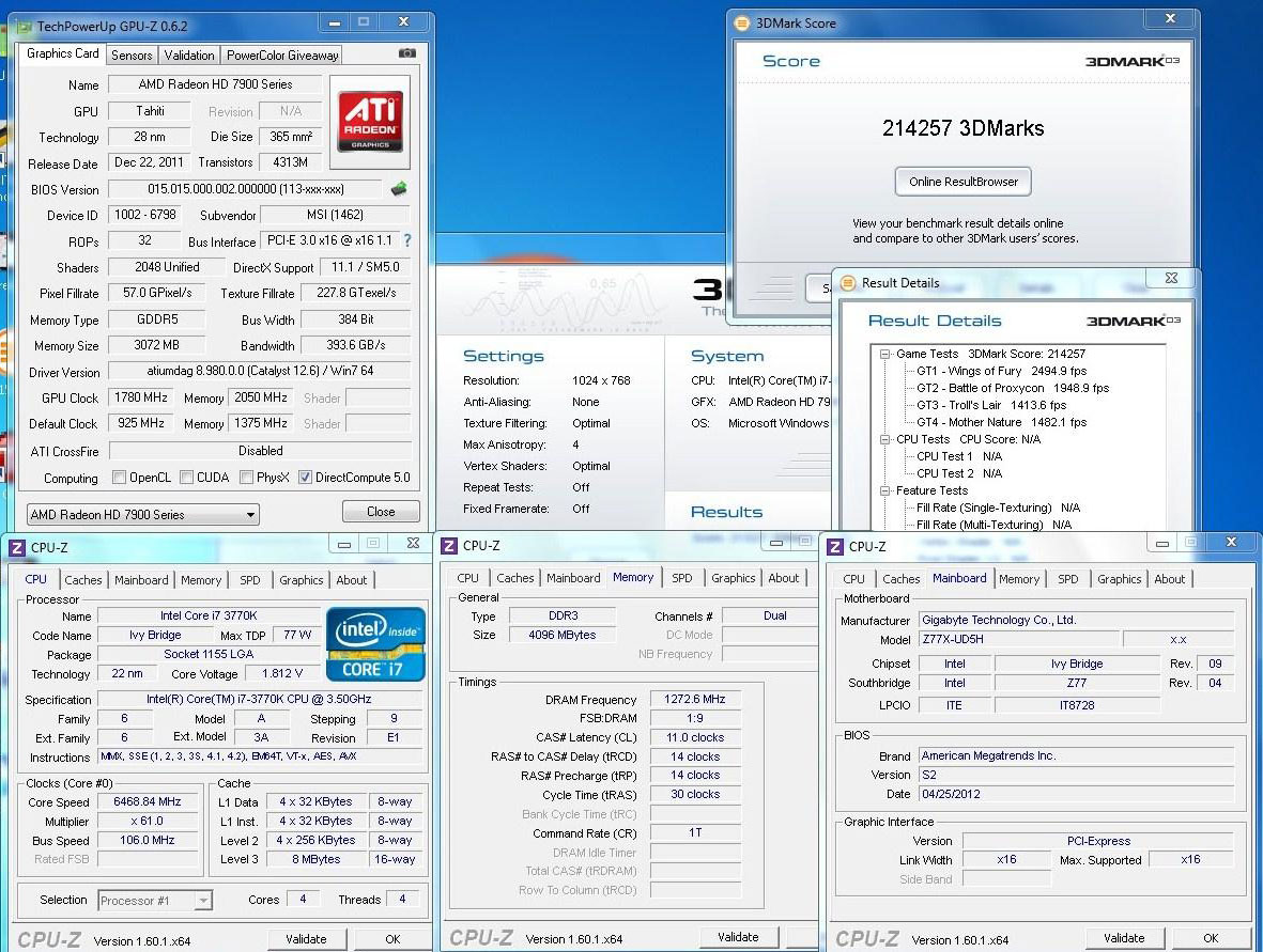 Параллельно Aristidis установил новый мировой рекорд в дисциплине 3DMark03 — 214257 очков. Для этого ему понадобились: материнская плата Gigabyte GA-Z77X-UD5H (чипсет Intel Z77), четырехъядерный процессор Core i7-3770K (@6469 МГц), двухканальный комплект ОЗУ (@2545 МГц) и блок питания мощностью 1200 Вт.