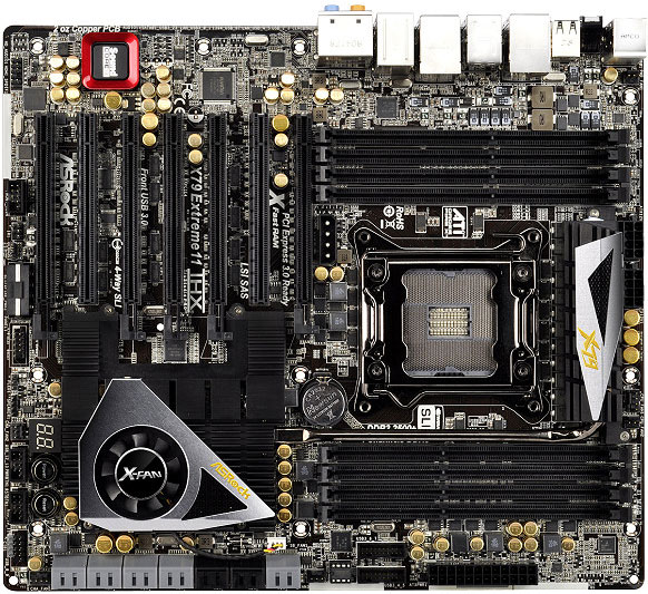 Со слов разработчика, ASRock X79 Extreme11 использует (24+2)-канальную схему питания процессорного гнезда LGA2011. Кроме основного разъема ATX 24-pin, имеются два EPS12V на 8 контактов и два Molex на 4 контакта. Последние необходимо задействовать при установке нескольких видеокарт. Среди элементов системы питания отметим цифровой ШИМ-контроллер Digi Power, «мосфеты» Dual-Stack (двухъярусные) и твердотельные конденсаторы Premium Gold Caps с длительным сроком службы. Восемь слотов для оперативной памяти DDR3 поддерживают модули с частотой 2500+ МГц. Другие интерфейсы — двойная гигабитная сеть Broadcom BCM57781, 8x USB 3.0 (4 порта на задней панели), 4x SATA 3 Гбит/с и 2x SATA 6 Гбит/с. С полными характеристиками X79 Extreme11 можно ознакомиться на сайте производителя.