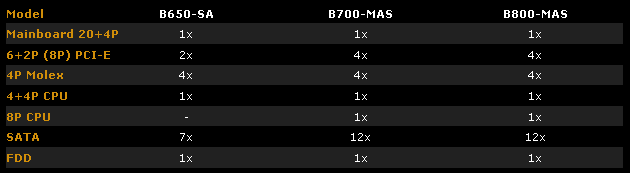 Линия +12 В у каждого источника питания одна. У B650-SA она рассчитана на 45 A (540 Вт), у B700-MAS — на 58 А (696 Вт), у B800-MAS — на 66 А (792 Вт). Предусмотрена система защиты от превышения мощности, перенапряжения, пониженного напряжения, перегрузки по току, перегрева и короткого замыкания.