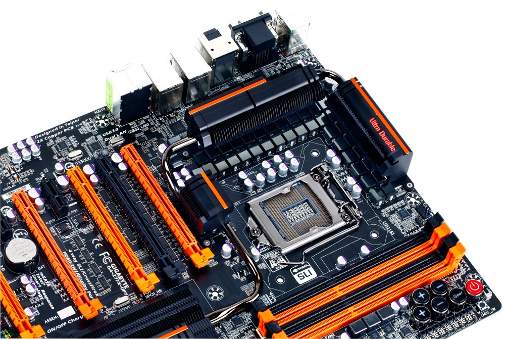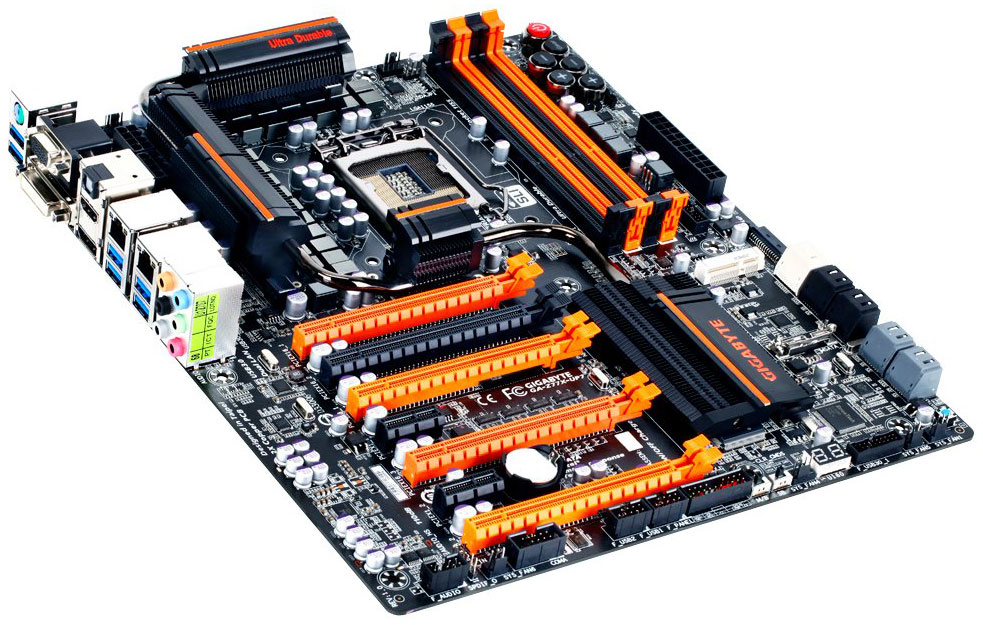Модель Z77X-UP7 сохранила 32 дросселя и как минимум 16 элементов DrMOS в цепях питания центрального процессора. По-видимому, половина фаз у платы «виртуальные», что, впрочем, не отменяет ее эксклюзивного статуса. С разъемом LGA1155 соседствуют четыре слота для оперативной памяти DDR3 с двухканальным доступом, группа оверклокерских кнопок для изменения частот и напряжений (не считая традиционных Power и Reset), а также контакты для замера основных напряжений.