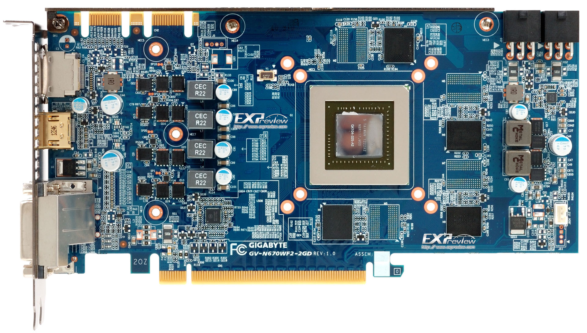 Подробный обзор модели Gigabyte GV-N670WF2-2GD опубликовал китайский веб-сайт Expreview, пролив свет на некоторые особенности новинки. Карту охлаждает двухслотовый кулер, конструкция которого включает две медные тепловые трубки диаметром 8 мм, непосредственно контактирующие с GPU, трехсекционный алюминиевый радиатор и два 100-мм вентилятора.