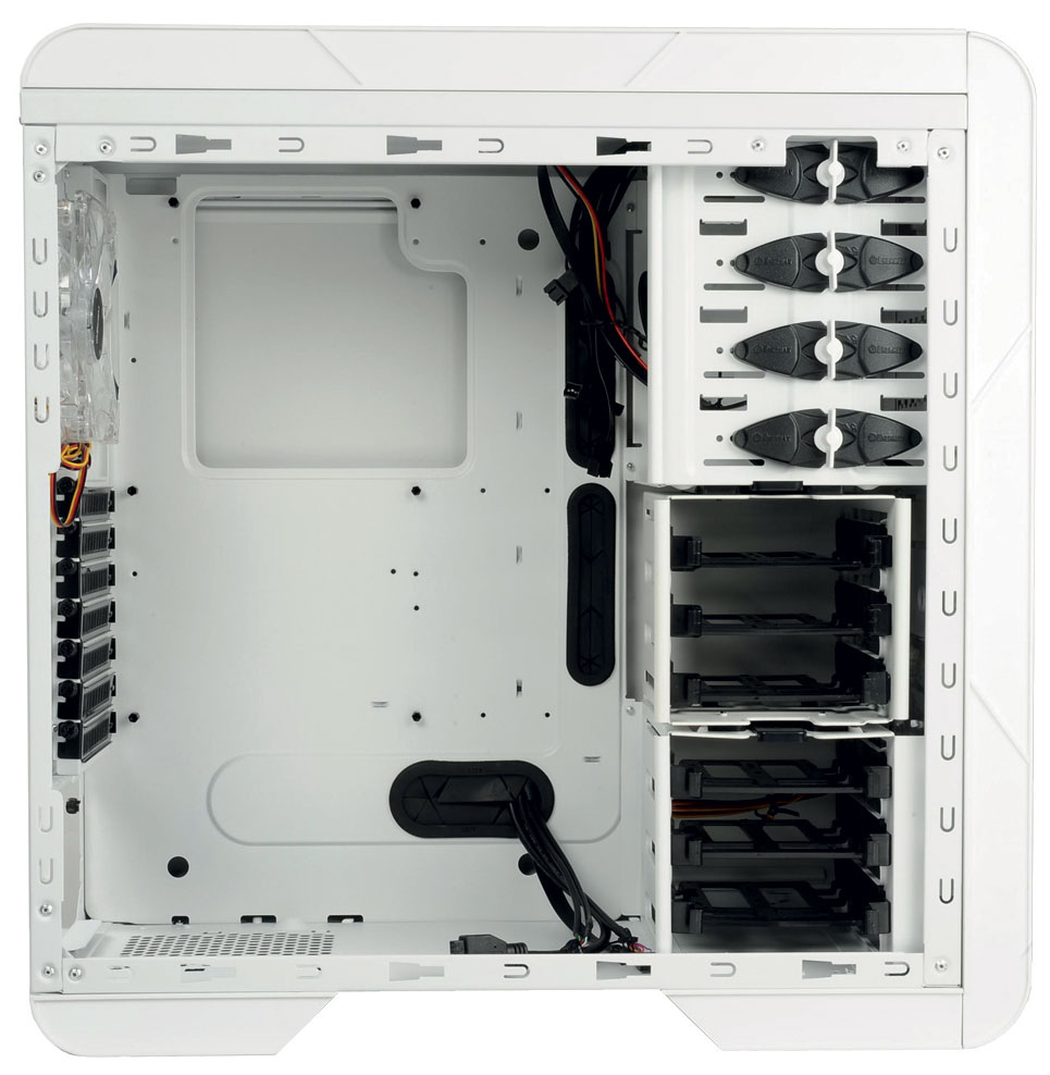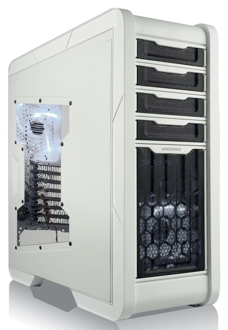 Модель с кодовым названием Enermax ECA3261-B окрашена в черный цвет как изнутри, так и снаружи, а ECA3261-W, соответственно, в белый, но с черными вставками. Практических различий между ними нет. Оба корпуса выполнены из холоднокатаной оцинкованной стали толщиной 0,6 мм, внутри можно разместить четыре 5,25" оптических привода или похожих устройства, шесть жестких дисков форм-фактора 2,5/3,5 дюйма в двух корзинах (одна снимается), еще три вентилятора типоразмера 120 или 140 мм, видеокарту длиной до 403 мм (286 мм с верхней корзиной HDD), ATX-совместимый блок питания и кулер высотой до 167 мм (или 143 мм при наличии бокового вентилятора на корпусе).
