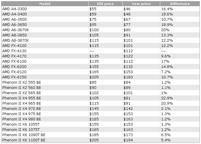 Весьма демократичными будут и цены на гибридные процессоры Llano с графикой Radeon HD 6000 (VLIW5). В частности, четырехъядерный A6-3670K со свободным множителем подешевеет со 100 до 80 долларов. Кроме того, упадет стоимость чипов FX, которые станут доступнее Phenom II X6. Так, довольно интересно смотрится FX-8120 за $153.