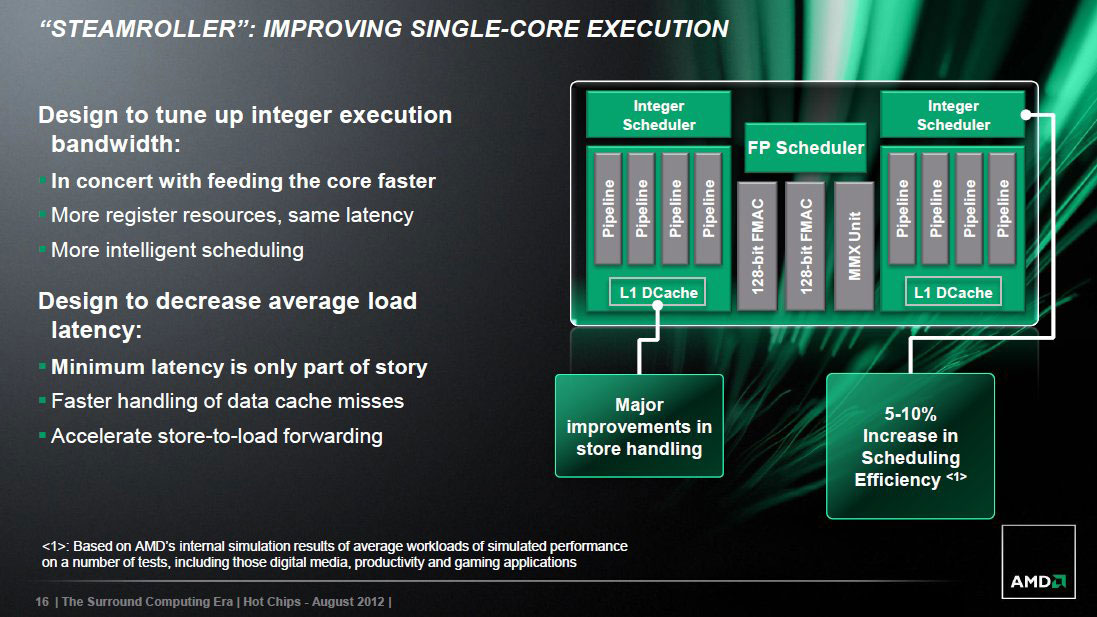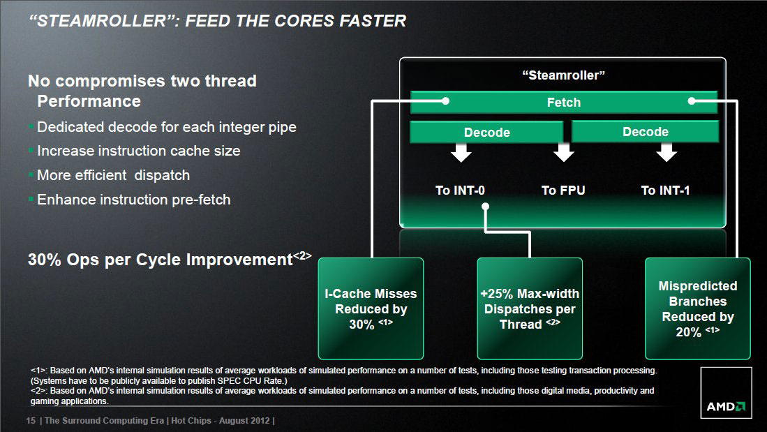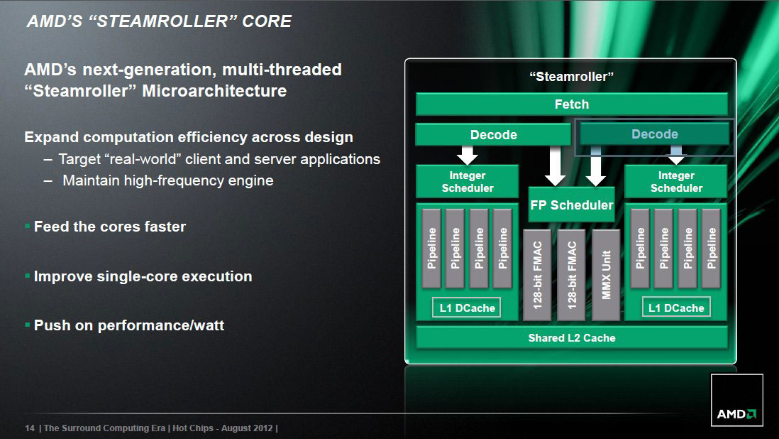 К сожалению, слухи о двукратном увеличении числа блоков FPU у процессоров AMD Steamroller не оправдались. Как и у Bulldozer с Piledriver, у «парового катка» в одном x86-модуле будет два блока целочисленных операций и один 256-битный блок операций с плавающей запятой. На это указывает сама AMD в документе, подготовленном к конференции Hot Chips (27—29 августа 2012 г.).