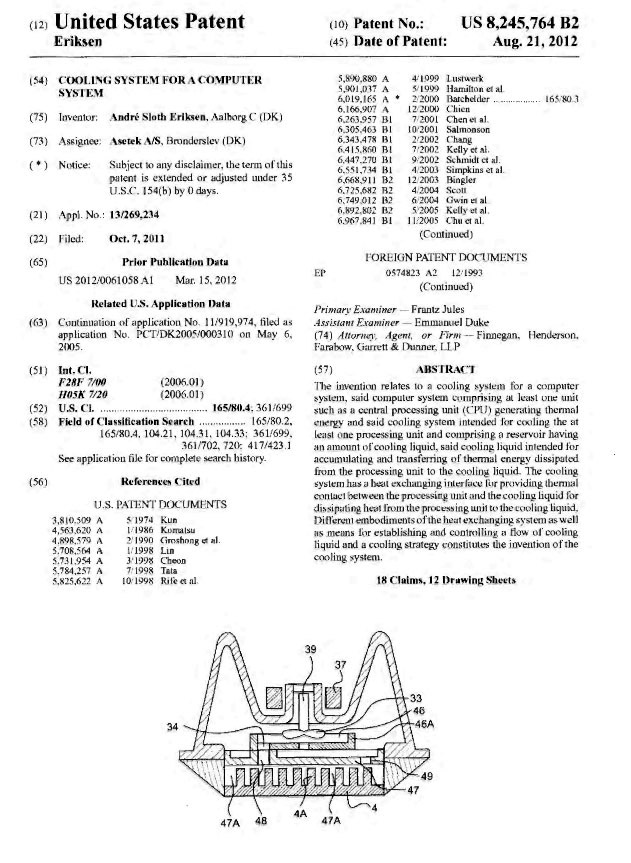 Согласно прилагаемым к означенному патенту чертежам, речь идет об изобретении водоблока с компактной встроенной помпой, который был впервые опробован на платформе Intel Socket 478. Несмотря на то, что разработка относится к 2006 году, в американском бюро по регистрации патентов и торговых марок (USPTO) она была зарегистрирована только на прошлой неделе — 21 августа — в том числе на основе ранее полученных международных патентов.