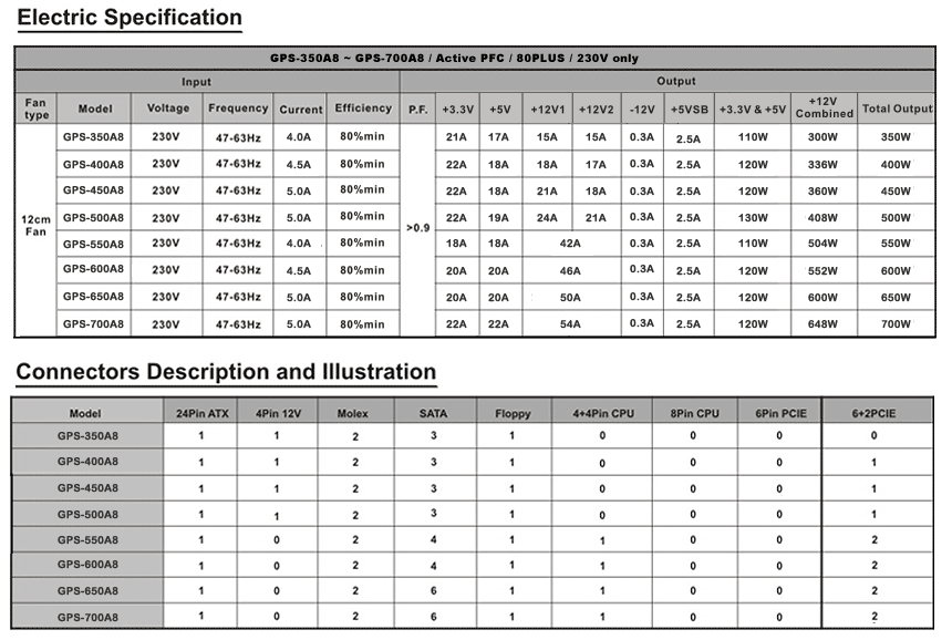 Модели с разъемом питания EPS12V (4+4)-pin и двумя кабелями PCI-E Power (6+2)-pin начинаются с номинала 550 Вт. 650-ваттный и 700-ваттный Chieftec Smart располагают шестью SATA Power. У скромного GPS-350A8 только один 4-контактный разъем ATX12V и три SATA Power, отдельных силовых кабелей для видеокарт не предусмотрено.