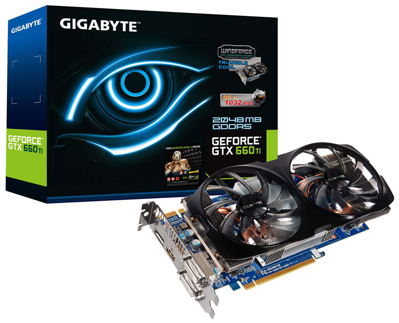 Видеокарта Gigabyte GeForce GTX 660 Ti WindForce 2X OC EU или GV-N66TOC-2GD-EU предназначена для европейского рынка. Ее строение и прикладные характеристики полностью совпадают с ранее анонсированной GV-N66TOC-2GD, просто в комплект включена игра Borderlands 2.