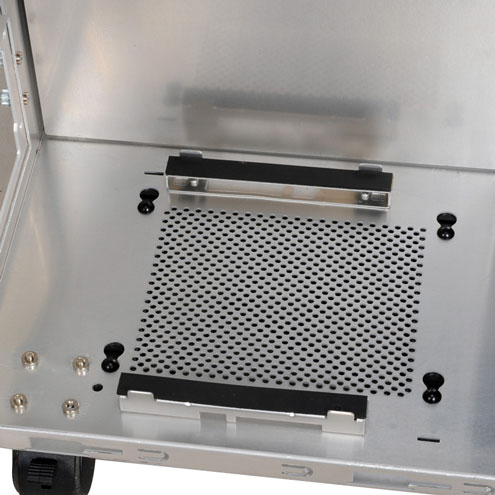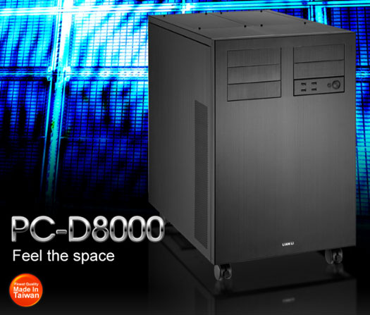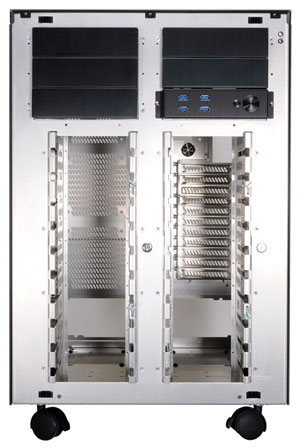 «Крепыш» рассчитан на установку двадцати (!) 3,5-дюймовых жестких дисков и доступен только в черной расцветке. В комплекте с PC-D8000 поставляется выносная панель с четырьмя портами USB 3.0. Шасси может вместить материнскую плату типоразмера от Mini-ITX (170x170 мм) до HPTX (345x381 мм), 11 карт расширения PCI Express длиной до 41 см, блок питания длиной до 36 см и процессорный кулер высотой до 16 см. Кроме того, имеются пять посадочных мест для оптических приводов. Внутри можно установить до 10 вентиляторов, но, к сожалению, ни один из них не входит в стандартный комплект поставки.