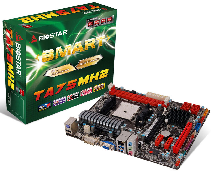 Плата форм-фактора microATX Biostar TA75MH2 (чипсет A75) поддерживает гибридные процессоры с тепловым пакетом до 100 Вт. Новинка оборудована пятью каналами питания сокета FM2, двумя слотами DDR3-1866, одним PCI-E 2.0 x16, шестью SATA 6 Гбит/с и четырьмя USB 3.0 (два порта на задней панели). Звук у TA75MH2 — 5.1-канальный, обеспечиваемый контроллером Realtek ALC662.